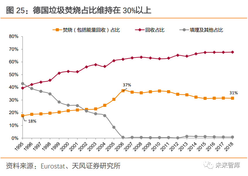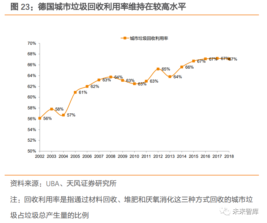 2.1.3. 德國(guó):重視回收循環(huán),“零填埋”政策下焚燒量較穩(wěn)定德國(guó)較早開(kāi)始實(shí)施垃圾分類(lèi),回收利用率較高。1992 年,德國(guó)在全國(guó)建立“綠點(diǎn)制”回收系統(tǒng),與各生產(chǎn)企業(yè)合作,將印有綠點(diǎn)標(biāo)記的、具有再生價(jià)值的包裝物回收再利用。2011 年,已經(jīng)有 1.6 萬(wàn)家德國(guó)包裝生產(chǎn)和使用企業(yè)加入了綠點(diǎn)系統(tǒng),超過(guò) 90%的商品外包裝印上了綠點(diǎn)標(biāo)記。分類(lèi)制度推行下,德國(guó)城市垃圾總產(chǎn)生量控制良好,由 2002 年的 5277 萬(wàn)噸變動(dòng)至 2018 年 5030 萬(wàn)噸,城市垃圾回收利用率也從 2002 年 56%上升至 2018 年 67%。