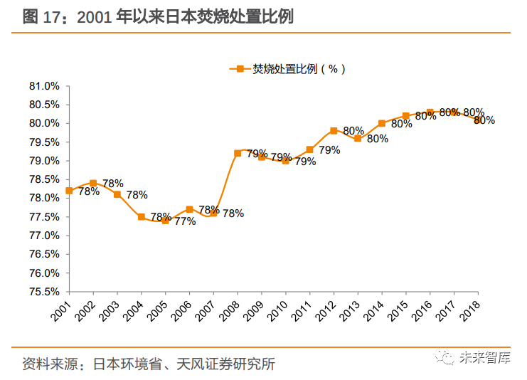 21 世紀(jì)以來(lái),行業(yè)步入整合期,焚燒占比維持在高位。1997 年,受“二噁英事件”影響, 日本政府制訂了新的法律來(lái)規(guī)范二噁英排放,許多老焚燒廠被迫關(guān)停。政府也要求相鄰的市合作以提高垃圾管理水平,通過(guò)建造更大、更高效的焚燒爐減少二噁英排放。同時(shí),政府相應(yīng)改變了國(guó)家補(bǔ)貼的發(fā)放門(mén)檻,只有大型的焚燒廠才能獲得補(bǔ)貼。在此背景下,日本垃圾焚燒廠經(jīng)歷了環(huán)保去產(chǎn)能及整合階段,焚燒處置量有所下滑,但焚燒占比始終處于高位,2012-2018 年維持在 80%。
