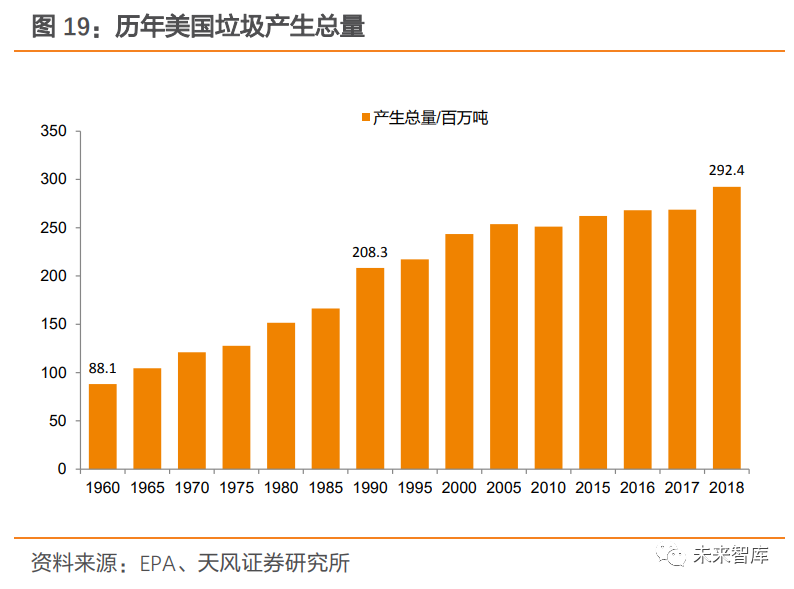 2.1.2. 美國(guó):以填埋為主,焚燒占比維持在 12%左右美國(guó)垃圾產(chǎn)生總量及人均垃圾產(chǎn)量趨于平穩(wěn)。1990 年,美國(guó)開(kāi)始建立資源垃圾分類(lèi)回收系統(tǒng),人均垃圾產(chǎn)量在實(shí)行垃圾分類(lèi)后開(kāi)始逐步趨于穩(wěn)定,1990 年人均垃圾產(chǎn)量為 4.57 磅/ 每天,2018年為 4.9 磅/每天;垃圾產(chǎn)生總量則由 1990 年 208.3 百萬(wàn)噸增加至 2018 年 292.4 百萬(wàn)噸。