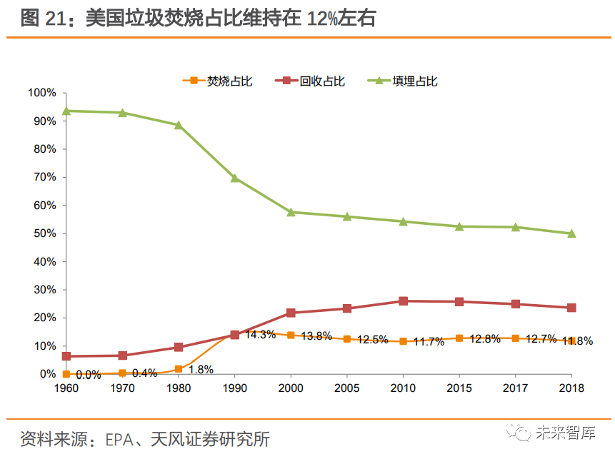 以填埋方式為主,焚燒量近年來(lái)保持穩(wěn)定,焚燒占比維持在12%左右。1980 年起,美國(guó)垃圾焚燒產(chǎn)業(yè)得到快速增長(zhǎng),垃圾焚燒量由 1980 年 280 萬(wàn)噸迅速提升至 1990 年 2980 萬(wàn)噸, 垃圾焚燒占比由 1980 年 1.8%增長(zhǎng)至 1990年14.3%。高速發(fā)展期后,美國(guó)垃圾焚燒量并未因 1990 年資源垃圾分類(lèi)回收系統(tǒng)的建立而出現(xiàn)明顯下降,21 世紀(jì)以來(lái)基本維持在 3000 萬(wàn)噸以上,焚燒占比也維持在 12%左右。相較于日本等國(guó)家,美國(guó)焚燒占比較低的一個(gè)重要原因在于土地面積大,經(jīng)濟(jì)成本較低的填埋方式更受青睞。