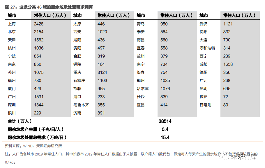 2.2. 展望國(guó)內(nèi):垃圾產(chǎn)量及焚燒占比仍處上升通道,焚燒需求將保持旺盛2.2.1. 垃圾分類(lèi)減量化效果短期較難兌現(xiàn),廚余產(chǎn)能落地是關(guān)鍵影響因素從實(shí)際情況看,垃圾分類(lèi)減量程度受廚余產(chǎn)能規(guī)模影響。由于有害垃圾占比很小,可回收垃圾在過(guò)去資源化利用率也較高,濕垃圾分出量對(duì)無(wú)害化處置總量影響較大。但在廚余處置產(chǎn)能不足情況下,從分揀前端分離出的濕垃圾,仍需通過(guò)焚燒等無(wú)害化處置方式進(jìn)行最終解決,會(huì)削弱減量化效果。廚余產(chǎn)能缺口較大,許多城市推進(jìn)垃圾分類(lèi)工作時(shí),仍面臨缺乏專(zhuān)業(yè)大型廚余垃圾處置設(shè)施這一難題。以濕垃圾末端處理設(shè)施建設(shè)進(jìn)度較快的上海為例,截至 2020 年 6 月中旬, 濕垃圾分出量達(dá) 9632.13 噸/日,大于目前濕垃圾處置能力 5050 噸/日。據(jù)我們預(yù)測(cè), 46 個(gè)垃圾分類(lèi)重點(diǎn)城市,每日廚余垃圾(不含餐廚垃圾)處置需求達(dá) 15.4 萬(wàn)噸。而據(jù) E20 公布,2019 年 5 月底,大規(guī)模廚余垃圾處理廠每日總處理能力合計(jì)僅為 0.6 萬(wàn)噸。