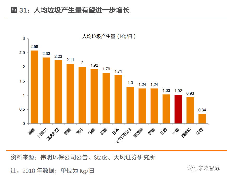 初始投資大+建設(shè)周期長(zhǎng),補(bǔ)齊廚余產(chǎn)能缺口仍需時(shí)間,短期來(lái)看垃圾分類(lèi)“量減”影響有限。據(jù) E20 統(tǒng)計(jì),2020 年上半年,餐廚/廚余處理處置項(xiàng)目共計(jì)成交 39 個(gè),成交數(shù)量?jī)H次于垃圾焚燒板塊,占固廢市場(chǎng)總成交項(xiàng)目個(gè)數(shù)比例超 35%。目前各地正加快推進(jìn)廚余設(shè)施建設(shè),但廚余處置項(xiàng)目前期投資較大,且從規(guī)劃、建設(shè)到實(shí)際投運(yùn)的周期也較長(zhǎng),補(bǔ)齊 產(chǎn)能缺口仍需時(shí)間。在現(xiàn)階段廚余產(chǎn)能與垃圾分類(lèi)制度推行不匹配情況下,預(yù)計(jì)垃圾分類(lèi)帶來(lái)的“量減”影響有限。2.2.2. 總量增+焚燒占比提升,需求仍將保持旺盛隨著城鎮(zhèn)化穩(wěn)步推進(jìn),我國(guó)人均垃圾產(chǎn)量及垃圾總產(chǎn)生量有望繼續(xù)增長(zhǎng)。根據(jù)世界銀行的數(shù)據(jù),城鎮(zhèn)化率提升和人均垃圾產(chǎn)生量有一定正相關(guān)性。近年來(lái),我國(guó)城鎮(zhèn)化進(jìn)程加速推進(jìn),2019 年底城鎮(zhèn)化率已達(dá) 61%,但仍低于國(guó)外發(fā)達(dá)國(guó)家(如美國(guó)、日本 2018 年城鎮(zhèn)化 率分別為 82.3%、91.6%)。且我國(guó)人均垃圾產(chǎn)生量也較低,據(jù) Statista 數(shù)據(jù)顯示,2018 年我國(guó)人均垃圾產(chǎn)生量 1.02Kg/日,而同期的美國(guó)、加拿大、澳大利亞等地區(qū)的人均垃圾產(chǎn)生量均超過(guò) 2kg/日。展望未來(lái),隨著城鎮(zhèn)化進(jìn)一步推進(jìn),人均垃圾產(chǎn)生量有望進(jìn)一步提升,疊加人口增速共同帶動(dòng)生活垃圾產(chǎn)生量繼續(xù)增長(zhǎng),對(duì)垃圾處置需求構(gòu)成有力支撐。