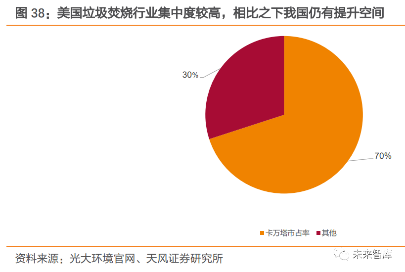 行業(yè)集中度較國(guó)外發(fā)達(dá)國(guó)家仍有差距,未來(lái)有望進(jìn)一步提升。據(jù)卡萬(wàn)塔公司總裁 2019 年 10 月發(fā)言介紹,卡萬(wàn)塔在美國(guó)市場(chǎng)的占有率已接近 70%。相比之下,我國(guó)垃圾焚燒行業(yè)龍頭企業(yè)市占率仍較低,未來(lái)有望通過(guò)并購(gòu)整合,繼續(xù)擴(kuò)大市場(chǎng)規(guī)模,行業(yè)集中度或?qū)⑦M(jìn)一步提高。