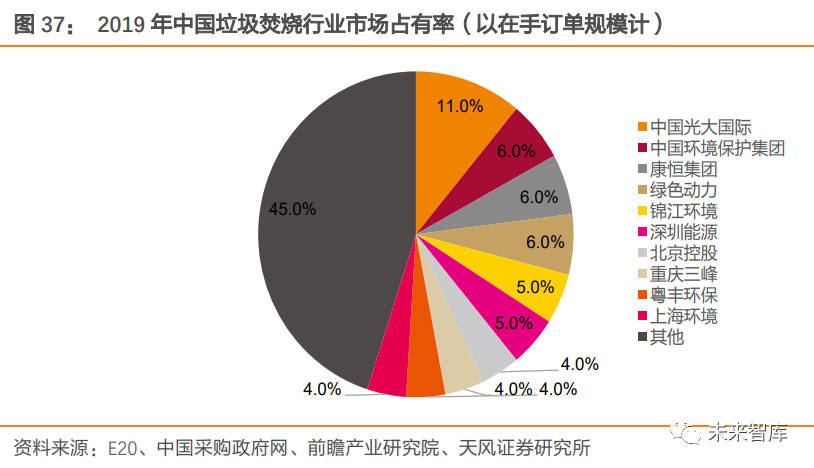預(yù)計(jì)到 2025 年,我國(guó)生活垃圾焚燒無(wú)害化處理能力將達(dá) 100 萬(wàn)噸/日,較 2018 年新增產(chǎn)能 59 萬(wàn)噸/日。2.3. 國(guó)內(nèi)行業(yè)集中度提升+海外市場(chǎng)拓展,龍頭增速有望高于行業(yè)垃圾焚燒企業(yè)加速“跑馬圈地”,在手訂單規(guī)模不斷擴(kuò)大。前些年在一系列政策大力支持下,各城市競(jìng)相建立垃圾焚燒發(fā)電廠,并在國(guó)內(nèi)掀起投資并購(gòu)浪潮。行業(yè)外企業(yè)通過(guò)并購(gòu)快速切入垃圾焚燒領(lǐng)域,行業(yè)內(nèi)企業(yè)借助并購(gòu)迅速擴(kuò)大自身規(guī)模。例如,2011 年,水務(wù)領(lǐng)域龍頭首創(chuàng)股份通過(guò)收購(gòu)新環(huán)保能源,將業(yè)務(wù)拓展至固廢處理領(lǐng)域;2013 年,瀚藍(lán)環(huán)境收購(gòu)創(chuàng)冠環(huán)保(中國(guó))有限公司 100%股權(quán),垃圾規(guī)劃處理能力一年內(nèi)提升四倍。并購(gòu)趨勢(shì)下,龍頭企業(yè)在手規(guī)模不斷擴(kuò)大,截至 2019 年,在手訂單規(guī)模前十企業(yè)市占率達(dá) 55%,前三占有率分別為 11/6/6%。