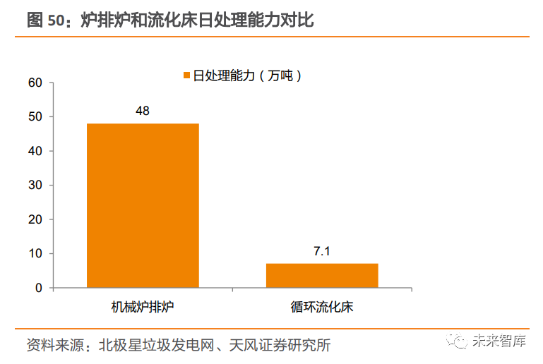 3.2.2. 噸發(fā)電量提升原因二:技術(shù)工藝優(yōu)化爐排爐已成為成熟的技術(shù)路線。垃圾焚燒技術(shù)主要包括流化床焚燒和爐排爐焚燒。在行業(yè)發(fā)展初期,由于國(guó)外引進(jìn)的爐排爐焚燒技術(shù)存在不適應(yīng)性以及成本高昂等問(wèn)題,國(guó)內(nèi)自主研發(fā)的流化床焚燒技術(shù)應(yīng)用較多。隨著國(guó)產(chǎn)化爐排爐技術(shù)發(fā)展,以及流化床技術(shù)“多飛灰” 不足的凸顯,爐排爐技術(shù)逐漸取代流化床技術(shù),得到快速發(fā)展。從現(xiàn)有爐型分布上看,2020 年,全國(guó)已運(yùn)行垃圾焚燒廠 492 座,涉及 1202 臺(tái)焚燒爐,其中,機(jī)械爐排爐臺(tái)數(shù)占比超過(guò) 86%,循環(huán)流化床臺(tái)數(shù)占比不到 14%;從處置量來(lái)看,全國(guó)機(jī)械爐排爐日合計(jì)處理能力超過(guò) 48 萬(wàn)噸,循環(huán)流化床日合計(jì)處理能力僅為 7 萬(wàn) 1 千噸左 右。