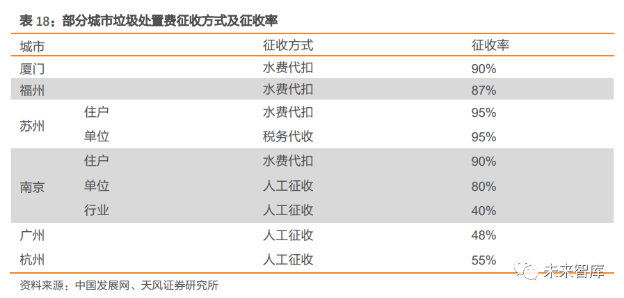 噸發(fā)電量提升30-54 度/噸(提升 10-18%),可對(duì)沖政策負(fù)向影響。對(duì)一個(gè)日處置量 1000 噸的垃圾焚燒項(xiàng)目進(jìn)行測(cè)算,假設(shè)在項(xiàng)目補(bǔ)貼結(jié)束后,標(biāo)桿上網(wǎng)電價(jià)按 0.45 元/度確認(rèn);在技術(shù)提升所帶來(lái)的不同上網(wǎng)電量情景假定下,我們發(fā)現(xiàn),假定其他條件不變,補(bǔ)貼 15 年后退坡,若項(xiàng)目噸發(fā)電量較測(cè)算基準(zhǔn)(300 度/噸)提升 30 度/噸(提升 10%),將能維持項(xiàng)目的 IRR 不變(8.8%)。補(bǔ)貼 10 年后退坡,若項(xiàng)目噸發(fā)電量較測(cè)算基準(zhǔn)提升 54 度/ 噸(提升 18%),項(xiàng)目的 IRR 也能保持不變。3.3. 收費(fèi)制度逐步完善,垃圾處置費(fèi)有望上調(diào)3.3.1. 國(guó)內(nèi)以定額征收為主,財(cái)政補(bǔ)貼缺口較大垃圾處置收費(fèi)制度主要包括定額征收及計(jì)量征收。定額征收主要指以家庭住戶(hù)或者個(gè)人作為收費(fèi)單位,不論垃圾排放量的多少,一律按照當(dāng)?shù)卣_定的繳費(fèi)標(biāo)準(zhǔn)進(jìn)行繳費(fèi),收費(fèi)標(biāo)準(zhǔn)較低。計(jì)量征收包括按指定垃圾桶數(shù)征收、按垃圾重量征收和按垃圾袋數(shù)量征收等, 與垃圾產(chǎn)生量直接掛鉤。1991 年,我國(guó)開(kāi)始提出對(duì)城市垃圾處置實(shí)行服務(wù)性收費(fèi)制度,并于 2018 年首次提出 “按量收費(fèi)”經(jīng)濟(jì)政策。以 2002 年 6 月國(guó)家發(fā)改委等部委聯(lián)合頒布《關(guān)于實(shí)行城市生活垃圾處理收費(fèi)制度促進(jìn)垃圾處理產(chǎn)業(yè)化的通知》 為時(shí)間節(jié)點(diǎn), 我國(guó)正式開(kāi)征城市生活垃圾處置費(fèi)。自 2011 年起, 一些城市政府高度重視垃圾分類(lèi), “按量收費(fèi)”政策在北京與廣州兩個(gè) 城市先后醞釀并試點(diǎn)。2018 年 6 月,國(guó)家發(fā)改委發(fā)布《關(guān)于創(chuàng)新和完善促進(jìn)綠色發(fā)展價(jià)格機(jī)制的意見(jiàn)》,提出 2020 年底前,全國(guó)城市及建制鎮(zhèn)全面建立生活垃圾處理收費(fèi)制度, 同時(shí)首次明確提出 “按量收費(fèi)”的經(jīng)濟(jì)政策,嘗試以經(jīng)濟(jì)激勵(lì)改變行為人的垃圾處置行 為。居民端收費(fèi)以定額為主,非居民端實(shí)現(xiàn)計(jì)量征收。①收費(fèi)標(biāo)準(zhǔn):據(jù)國(guó)家發(fā)改委的數(shù)據(jù),除沈陽(yáng)、寧波和上海外,33 個(gè)城市制定了居民生活垃圾處置費(fèi)收費(fèi)標(biāo)準(zhǔn),其中,長(zhǎng)沙、???和烏魯木齊為水消費(fèi)系數(shù)法隨水計(jì)征,深圳為按排污水量計(jì)征,其他 28 個(gè)城市為按戶(hù)或按人計(jì)征。除沈陽(yáng)外,35 個(gè)城市制定了非居民生活垃圾處理收費(fèi)標(biāo)準(zhǔn)。②收費(fèi)方式:主要 是上門(mén)收取和委托代收,采取委托代收的,一般為委托居委會(huì)、物業(yè)公司代收,委托稅務(wù)、 工商、財(cái)政等部門(mén)代收代繳,或與水費(fèi)、燃?xì)赓M(fèi)等公用事業(yè)費(fèi)用聯(lián)合收取等。