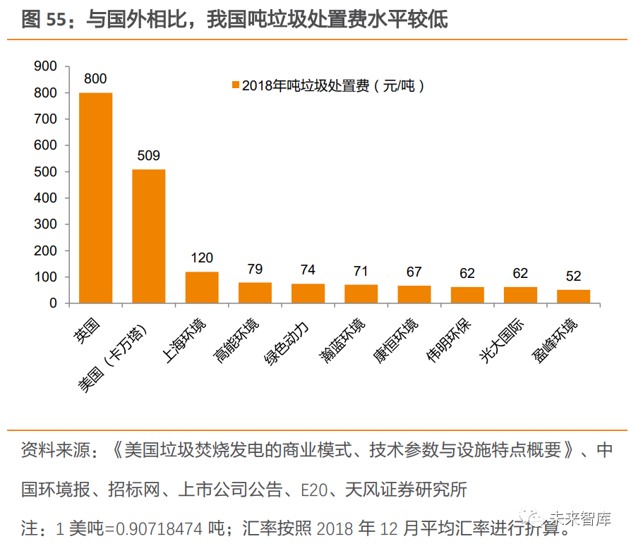 相較于流化床技術(shù),爐排爐技術(shù)因垃圾瀝水量較多、鍋爐效率較高等原因,具有更高的噸上網(wǎng)量,從而帶動(dòng)垃圾焚燒發(fā)電企業(yè)盈利能力提升。中溫次高壓技術(shù)逐步得到推廣。在過(guò)去,受限于生活垃圾的復(fù)雜性以及焚燒發(fā)電技術(shù)處理水平有限,國(guó)內(nèi)垃圾焚燒電廠基本采用中溫中壓蒸汽參數(shù)來(lái)防止過(guò)熱器等受熱面管高溫腐蝕。但據(jù)《生活垃圾焚燒廠噸垃圾發(fā)電量的研究分析》研究表明,垃圾熱值相近的情況下, 使用中溫次高壓參數(shù)時(shí)發(fā)電量更高。隨著我國(guó)垃圾分類(lèi)的推進(jìn)及焚燒發(fā)電技術(shù)日益成熟, 部分焚燒廠率先使用中溫次高壓技術(shù)來(lái)提高發(fā)電效率。例如在 2009 年,深能源投資的武漢市江北西部垃圾焚燒廠、福建創(chuàng)冠投資的湖北黃石垃圾焚燒發(fā)電廠、在建的北京廊坊垃圾焚燒發(fā)電項(xiàng)目等先后采用中溫次高壓技術(shù),在國(guó)內(nèi)掀起應(yīng)用熱潮,中溫次高壓技術(shù)也逐步得到推廣,進(jìn)一步提升噸發(fā)電量。3.2.3. 噸發(fā)電量較國(guó)外仍有較大提升空間我國(guó)噸發(fā)電量較發(fā)達(dá)國(guó)家仍有差距,未來(lái)提升空間較大。深圳市生活垃圾處理監(jiān)管中心發(fā)布的文章顯示,美國(guó)生活垃圾熱值可達(dá)到我國(guó)目前平均水平的兩倍,美國(guó)生活垃圾焚燒噸發(fā)電量也在 600kWh 以上,表明我國(guó)生活垃圾熱值及噸發(fā)電量仍有較大提升空間。展望未來(lái),垃圾分類(lèi)制度仍在持續(xù)推進(jìn),焚燒企業(yè)的處理工藝仍在不斷優(yōu)化,噸發(fā)電量提升未來(lái)可期,垃圾焚燒企業(yè)盈利能力有望得到持續(xù)優(yōu)化。