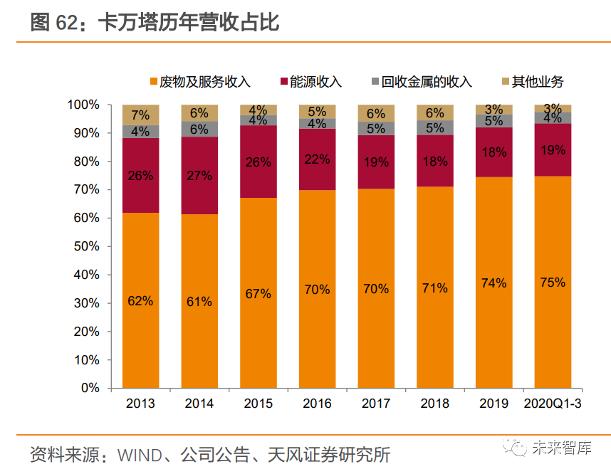 垃圾處置費(fèi)由“污染”主體承擔(dān),市場(chǎng)化程度較高。美國(guó)垃圾處置費(fèi)按照“誰(shuí)污染、誰(shuí)付費(fèi)”的原則,由當(dāng)?shù)卣蚴者\(yùn)企業(yè)向居民(企業(yè))收取,再支付給焚燒廠業(yè)主或運(yùn)營(yíng)商, 每噸垃圾處置費(fèi)在 50-70 美元之間居多。市場(chǎng)化機(jī)制下,垃圾處置費(fèi)成為垃圾焚燒廠收入 的最主要來(lái)源。美國(guó)焚燒企業(yè)垃圾處置費(fèi)占總運(yùn)營(yíng)收入的比例平均值約 70%,以卡萬(wàn)塔為例,垃圾處置費(fèi)收入占比常年高于 60%,2020Q1-3 垃圾處置費(fèi)收入占比達(dá) 75%。