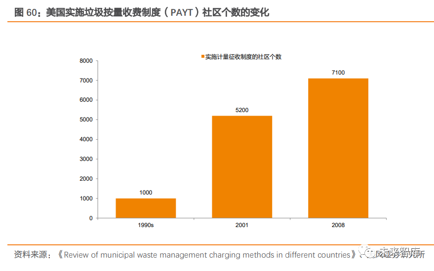 日本多采用單一計(jì)量收費(fèi)制。在日本,常見(jiàn)的垃圾收費(fèi)類(lèi)型有單一計(jì)量收費(fèi)制、累進(jìn)計(jì)量收費(fèi)制、定量免費(fèi)制、補(bǔ)助組合收費(fèi)制和定額收費(fèi)制 5 種。據(jù)山谷修作的調(diào)查統(tǒng)計(jì),截至2015 年 4 月,日本全國(guó) 457 個(gè)實(shí)行垃圾收費(fèi)的城市中,有 430 個(gè)城市采用單一計(jì)量收費(fèi)制,所占比率為 94%。在采用單一計(jì)量收費(fèi)制的城市中,單個(gè)垃圾袋價(jià)格(通常為 40~50L 的大袋)以 30-50 日元(1.92-3.20 人民幣)居多。日本垃圾處理廠建設(shè)資金及運(yùn)營(yíng)費(fèi)用由財(cái)政承擔(dān),財(cái)政支出負(fù)擔(dān)加大對(duì)垃圾有償收費(fèi)制度的實(shí)施有推動(dòng)作用。隨著日本垃圾處置費(fèi)用隨處置量與日俱增,財(cái)政支出負(fù)擔(dān)加大。例如 北九州市的日明凈工廠,在該地區(qū)未實(shí)施垃圾收費(fèi)制度時(shí),2008 年運(yùn)營(yíng)收入不及費(fèi)用支出的一半,剩余的運(yùn)營(yíng)費(fèi)用缺口部分需要依靠財(cái)政補(bǔ)貼。據(jù)《日本垃圾處理:政策演進(jìn)、影響因素與成功經(jīng)驗(yàn)》文中介紹,為了緩解財(cái)政支出壓力,日本實(shí)施生活垃圾有償收費(fèi)制度的市町村有所上升,以滿(mǎn)足垃圾處置資金需求,體現(xiàn)出財(cái)政支出壓力對(duì)垃圾收費(fèi)制度的推 動(dòng)作用。(2)美國(guó):以計(jì)量收費(fèi)制為主,垃圾處置費(fèi)由“污染”主體承擔(dān)美國(guó)較早推行計(jì)量收費(fèi)制。1980s 起,計(jì)量收費(fèi)制在美國(guó)多個(gè)地區(qū)興起。到 2008 年,美國(guó)已有 7100 個(gè)社區(qū),通過(guò)計(jì)量收費(fèi)的方式向 7500 萬(wàn)人征收垃圾處置費(fèi),約占總?cè)丝诘?25%。其采取的計(jì)量方式大多是隨垃圾桶或者垃圾袋、垃圾標(biāo)簽征收。以馬薩諸塞州的阿特爾伯勒為例,該地于 2005 年起實(shí)施計(jì)量收費(fèi)制度,居民每月需繳納 15 美元,每周可處理 36 加侖以?xún)?nèi)的垃圾,超過(guò)則需另外購(gòu)買(mǎi)購(gòu)物袋(7.2 加侖的購(gòu)物袋需支付 1.5 美元)。
