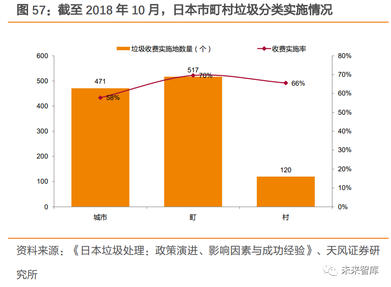 3.3.2. 國(guó)外發(fā)達(dá)國(guó)家以計(jì)量征收為主,征收水平較高相較于定額征收,計(jì)量征收對(duì)垃圾減量的激勵(lì)作用更大,也是國(guó)外發(fā)達(dá)國(guó)家的主要收費(fèi)方式。由于計(jì)量征收與垃圾產(chǎn)生量直接掛鉤,更容易讓居民及企業(yè)端產(chǎn)生 “自己污染、自 己負(fù)責(zé)”的意識(shí),以達(dá)到垃圾減量化的效果。大多數(shù)國(guó)外發(fā)達(dá)國(guó)家采取計(jì)量征收方式。(1)日本:垃圾收費(fèi)實(shí)施率高,多采用單一計(jì)量收費(fèi)制日本大規(guī)模實(shí)施垃圾收費(fèi)制度,收費(fèi)實(shí)施率較高。2000 年開(kāi)始,垃圾收費(fèi)制度在日本得到了大規(guī)模實(shí)施,2000 年至 2018 年 10 月共計(jì)新增 330 個(gè)垃圾收費(fèi)城市。日本東洋大學(xué)經(jīng)濟(jì)學(xué)系山谷修作教授的調(diào)查統(tǒng)計(jì)顯示,截至 2018 年 10 月,日本的城市、町、村收費(fèi)實(shí)施率分別為 57.8%、69.6%和 65.6%。