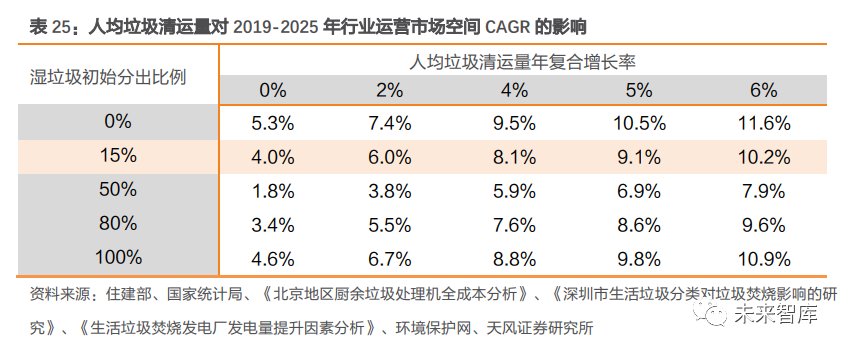 3.3.3. 我國(guó)垃圾收費(fèi)政策細(xì)則有望逐步完善,處置費(fèi)有望上調(diào)從國(guó)外實(shí)踐看,計(jì)量收費(fèi)制度下征收水平較高,能為垃圾焚燒廠處置費(fèi)收入提供更為充足的資金保障,但是否實(shí)施計(jì)量收費(fèi)制仍需衡量多方利益。一方面,制定計(jì)量收費(fèi)制度需要 更多政策的制定和執(zhí)行成本;另一方面,實(shí)施計(jì)量制度還需要用于計(jì)量的運(yùn)輸設(shè)備、健全的垃圾回收機(jī)制等。據(jù)《關(guān)于城市生活垃圾不同收費(fèi)制度的思考》文中分析,我國(guó)大部分城市未采用計(jì)量收費(fèi)制度的原因,除了更多的交易費(fèi)用外,還包括居民責(zé)任意識(shí)不強(qiáng)、回收機(jī)制不完全等,且這一制度有可能導(dǎo)致非法傾倒、私自焚燒垃圾等現(xiàn)象。國(guó)內(nèi)政策環(huán)境逐步成熟,征收方式有望向計(jì)量轉(zhuǎn)變,垃圾處置費(fèi)或?qū)⑸险{(diào)。從全球?qū)嵺`看, 人均 GDP 水平較高、回收體系較健全的發(fā)達(dá)國(guó)家更多采用計(jì)量收費(fèi)政策。我國(guó)人均 GDP 水平正在穩(wěn)步上升,加之垃圾分類(lèi)、回收體系的不斷健全以及居民環(huán)境意識(shí)的逐步增強(qiáng), 垃圾收費(fèi)制度有望向計(jì)量征收轉(zhuǎn)變。此外,隨著人工費(fèi)用、燃油和材料等價(jià)格上漲,定價(jià)部門(mén)預(yù)計(jì)將按實(shí)際情況細(xì)化收費(fèi)項(xiàng)目,調(diào)整收費(fèi)項(xiàng)目和費(fèi)率,垃圾焚燒企業(yè)垃圾處置費(fèi)也有望上調(diào)。垃圾處置單價(jià)上調(diào) 22%-39%可對(duì)沖政策負(fù)向影響。國(guó)補(bǔ)退坡政策施行后,若想維持項(xiàng)目盈利能力不變,垃圾焚燒企業(yè)可與地方政府協(xié)調(diào),爭(zhēng)取上調(diào)垃圾處置費(fèi),從而確保項(xiàng)目的盈利能力和收入水平。據(jù)我們測(cè)算,在補(bǔ)貼 15 年后退坡的假設(shè)下,為維持項(xiàng)目 IRR 不變,政府的垃圾處理單價(jià)應(yīng)該從 60 元/噸上調(diào)至 73 元/噸,上調(diào)幅度 22%;10 年后退坡,則應(yīng)上調(diào)至 83 元/噸,上調(diào)幅度 39%。4. 綜合成長(zhǎng)及盈利性因素,垃圾焚燒運(yùn)營(yíng)收入仍有增長(zhǎng)空間垃圾分類(lèi)會(huì)帶來(lái)“量減”和“熱值提升”雙向影響。垃圾分類(lèi)一方面會(huì)通過(guò)提高資源化處置量,影響焚燒處置量;另一方面也通過(guò)降低生活垃圾中濕垃圾占比,帶動(dòng)入爐垃圾熱值提升,使得噸發(fā)電量同步提升。綜合考慮垃圾分類(lèi)帶來(lái)的“量減”+“熱值升”,以及城鎮(zhèn)化率提升、技術(shù)工藝優(yōu)化等影響因素,據(jù)我們測(cè)算,2019-2025 年垃圾焚燒行業(yè)運(yùn)營(yíng)收入 GAGR 約 7%,垃圾分類(lèi)減量化影響下仍有增長(zhǎng)空間。①生活垃圾各成分占比:假定濕垃圾、可回收垃圾及干垃圾占比分別為 55%、10%、35%。由于有害垃圾占比很小,暫不考慮有害垃圾的影響。②分出比例:假定濕垃圾與可回收垃圾的分出比例相同,2019 年設(shè)定為 15%,隨著分類(lèi)體 系的健全,逐年提升 10%。③濕垃圾回收處置率:假定 2019 年濕垃圾回收處置率 40%,并隨著廚余處置產(chǎn)能擴(kuò)增,逐年提升 10%。④殘?jiān)急?/span>:由于濕垃圾資源化處置后的廢渣仍需通過(guò)焚燒進(jìn)行最終處置,假定殘?jiān)急?20%。⑤由垃圾分類(lèi)導(dǎo)致的噸發(fā)提升量:據(jù)《深圳市生活垃圾分類(lèi)對(duì)垃圾焚燒影響的研究》相關(guān)內(nèi)容,我們推算出當(dāng)濕垃圾在入爐垃圾中的占比降低 1% 時(shí),噸垃圾發(fā)電量可以提升 2.2-3.0Kwh,保守假定濕垃圾占比下降 1%會(huì)帶來(lái)噸發(fā)電量提升 2.2Kwh。⑥由技術(shù)工藝優(yōu)化導(dǎo)致的噸發(fā)提升量:據(jù)《生活垃圾焚燒發(fā)電廠發(fā)電量提升因素分析》介紹,李坑一廠借助中溫超高壓技術(shù),噸垃圾發(fā)電量達(dá) 350~360kWh,以及在垃圾熱值相近 的情況下,中溫次高壓余熱鍋爐發(fā)電量增加 17%。我們假定技術(shù)優(yōu)化帶來(lái)噸發(fā)電量提升50Kwh,由2019年300Kwh線性提升至2025年350Kwh。⑦噸垃圾處置費(fèi)及年復(fù)合增長(zhǎng)率:假定 2019 年噸垃圾處置費(fèi)單價(jià) 70 元,未來(lái)每年按 CPI 增速 3%增長(zhǎng)。城鎮(zhèn)化率提升+人均垃圾清運(yùn)量提升+技術(shù)優(yōu)化三道屏障,可對(duì)沖垃圾分類(lèi)減量影響,運(yùn)營(yíng)總收入市場(chǎng)空間有望保持增長(zhǎng)。若從靜態(tài)時(shí)點(diǎn)單獨(dú)分析垃圾分類(lèi)對(duì)焚燒量的影響,在 2019 年數(shù)據(jù)及相關(guān)假設(shè)的基礎(chǔ)上,相較于垃圾分類(lèi)前,隨著濕垃圾分出比例提升,焚燒處置量下滑程度加大。但從長(zhǎng)期動(dòng)態(tài)視角看,在城鎮(zhèn)化率、人均垃圾清運(yùn)量、焚燒占比共同提升趨勢(shì)下,焚燒需求仍將保持旺盛,疊加垃圾分類(lèi)及技術(shù)進(jìn)步驅(qū)動(dòng)下的噸上網(wǎng)電量提升,垃圾焚燒廠運(yùn)營(yíng)收入市場(chǎng)空間有望保持正增長(zhǎng)。