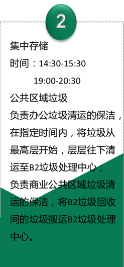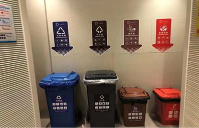 樓層公共區(qū)域的保潔工作人員負責垃圾初步分類,分類垃圾桶內的垃圾袋按顏色區(qū)分,在垃圾分好類并用袋裝密封后,將由專人從上至下層層收集并運輸,減少貨梯使用時間,提高垃圾運輸效率。