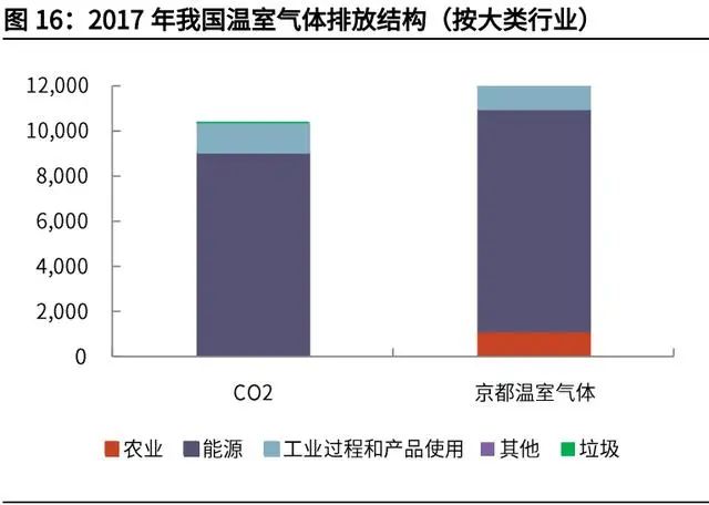 除了能源使用(主要是化石燃料燃燒及電力/熱力使用),工業(yè)過程碳排放也是 重要的二氧化碳來源,2017 年占比 13%。工業(yè)過程碳排放與各個(gè)行業(yè)采用的生產(chǎn)工藝直接相關(guān)。