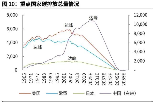 我國碳排放下降斜率更大。由于發(fā)展階段的不同,發(fā)達(dá)國家已普遍經(jīng)歷“碳達(dá)峰”, 為達(dá)到 2050 年“碳中和”,更大程度上只是延續(xù)以往的減排斜率。而我國碳排 放總量仍在增加,需要經(jīng)歷 2030 年前“碳達(dá)峰”,然后走向 2060 年前“碳中 和”。從實(shí)現(xiàn)“碳中和”的年限來看,比發(fā)達(dá)國家時(shí)間更緊迫,碳排放下降的斜 率更大。