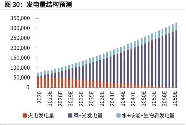 根據(jù)我們的上述假設(shè),以 2019 年發(fā)電量 7.22 萬億千瓦時(shí)為基礎(chǔ),2030 年發(fā)電 量達(dá)到 11.9 萬億千瓦時(shí)(和部分機(jī)構(gòu)的預(yù)測數(shù)據(jù)基本一致),2060 年發(fā)電量進(jìn)一步達(dá)到 32.71 萬億千瓦時(shí)。