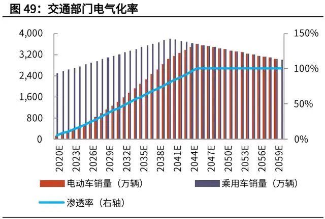 我們預(yù)計(jì),乘用車銷量在 2040 年見頂,電動(dòng)車的滲透率在 2045 年達(dá)到 100%, 則電動(dòng)車的銷量將在 2045 年達(dá)到 3600 萬輛/年。假設(shè)單車售價(jià)保持下行趨勢, 在 2060 年達(dá)到 12 萬元/輛左右。則電動(dòng)車領(lǐng)域累計(jì)將帶來 130 萬億人民幣的累 計(jì)新增投資。