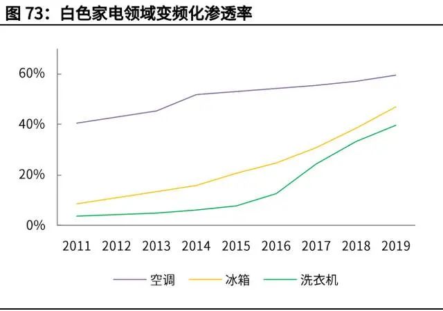 根據(jù)產(chǎn)業(yè)在線統(tǒng)計(jì),2013 年變頻空調(diào)標(biāo)準(zhǔn)頒布實(shí)施,空調(diào)的變頻占有率提升超 過了 6 個(gè)百分點(diǎn);2016 年 10 月份冰箱新標(biāo)準(zhǔn)實(shí)施,2017 年冰箱的變頻化率迅 速提高了 10%;洗衣機(jī)新標(biāo)準(zhǔn)在 2018 年 10 月推出,2019 年變頻洗衣機(jī)的市 占率較推出前大幅增加了 8 個(gè)百分點(diǎn)。