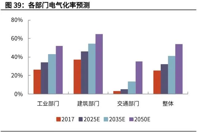 由于能源供給側(cè)向綠色電力轉(zhuǎn)變,所以需求側(cè)的脫碳首先意味著終端電氣化。根據(jù)國網(wǎng)能源研究院 2019 年 12 月的研究成果,終端電氣化率在 2050 年達(dá)到 50%以上,其中工業(yè)、建筑、交通部門分別達(dá)到 52%、65%、35%。