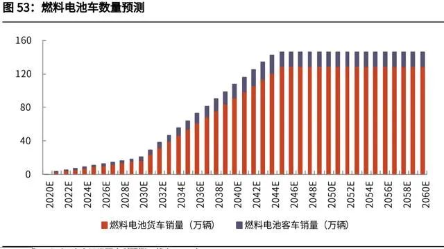 氫能燃料電池將主要用于重型道路交通(客車、貨車)。假設(shè)輕型、中型、大型 貨車的年銷量保持在 150、20、70 萬輛,燃料電池滲透率在 2045 年達(dá)到 40%、 60%、80%,而后保持該滲透率;輕型、中型、大型客車的年銷量保持 30、7、 7 萬輛,燃料電池滲透率在 2045 年達(dá)到 30%、50%、70%,而后保持該滲透率, 則累計(jì)新增投資達(dá)到 29 萬億元人民幣。