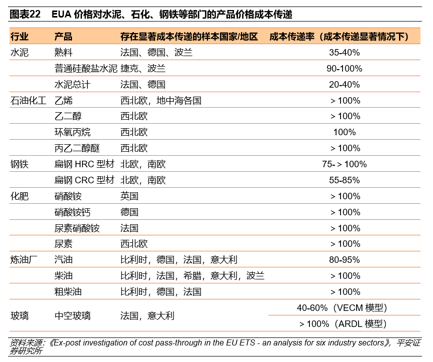 對商品市場而言,碳交易價格與相關(guān)產(chǎn)品價格同向波動,EUA價格作為成本可能傳遞至電力、鋼鐵、水泥、煉油等行業(yè),引發(fā)產(chǎn)品價格相應上升。