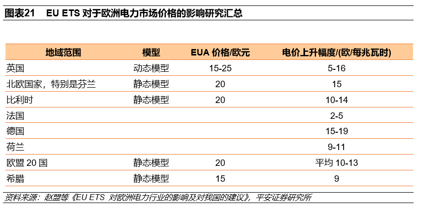 對企業(yè)業(yè)績而言,碳價格可通過企業(yè)出售過量碳排放配額、增加企業(yè)碳成本或轉(zhuǎn)嫁成本導致產(chǎn)品價格上升等影響企業(yè)業(yè)績,EU ETS的第一階段到第三階段的電力行業(yè)獲得意外暴利,這也主要取決于電廠機組新能源占比。