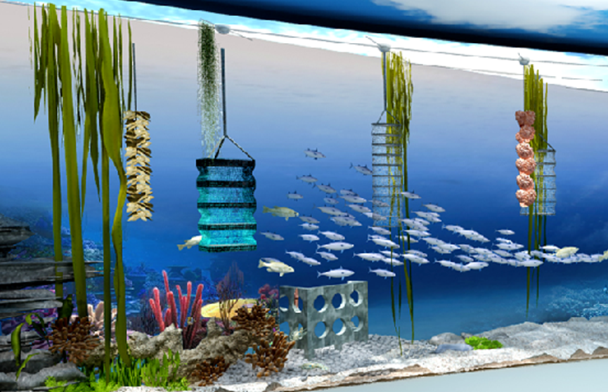 多營養(yǎng)層次綜合養(yǎng)殖模式?!岸酄I養(yǎng)層次綜合養(yǎng)殖模式”是指在同一養(yǎng)殖區(qū)域內合理搭配不同營養(yǎng)層級、養(yǎng)殖生態(tài)位互補的動植物,實現(xiàn)水質調控、營養(yǎng)物質循環(huán)利用、生態(tài)防病及質量安全控制,在提高養(yǎng)殖效益的同時減少養(yǎng)殖廢物排放。威海市尋山集團與水科院黃海所合作,在桑溝灣海域構建“721模式”,即上層養(yǎng)殖海帶,占單位養(yǎng)殖面積的70%;中層養(yǎng)殖貝類、魚類,占單位養(yǎng)殖面積的20%;底層養(yǎng)殖鮑魚、海參,占位養(yǎng)殖面積的10%。該模式與傳統(tǒng)單一養(yǎng)殖模式相比,年產出增加30%,固碳量11萬噸。桑溝灣多營養(yǎng)層級養(yǎng)殖模式累計吸引了全世界30多個國家和地區(qū)的專家學者前來學習考察,成為綠色養(yǎng)殖樣板。圖 6 多營養(yǎng)層次綜合養(yǎng)殖模式示意圖表 1 立體生態(tài)養(yǎng)殖每畝產量及收益情況對比表注:貝類及底播增殖品種養(yǎng)殖周期為2-2.5年工業(yè)化循環(huán)水養(yǎng)殖技術模式。采用標準化、模塊化、工業(yè)化循環(huán)水養(yǎng)殖技術,通過水質測控、糞便收集、水體凈化、恒溫供氧、魚菜共生和智慧漁業(yè)等功能模塊,實現(xiàn)資源高效利用、循環(huán)用水、環(huán)保節(jié)能和風險控制。該模式養(yǎng)殖全程在相對封閉的養(yǎng)殖池內完成,可實現(xiàn)水資源循環(huán)利用、飼料精準投喂、污水與廢物近乎零排放,單位水體產出約是普通池塘養(yǎng)殖的20倍,單位產量耗能僅為普通池塘養(yǎng)殖的1/3。