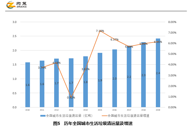 據(jù)統(tǒng)計,全國城市生活垃圾清運量持續(xù)增長,2019年達(dá)2.4億噸,按近四年平均6%左右的增速計算,預(yù)測2020年達(dá)2.6億噸,2025年達(dá)3.4億噸。