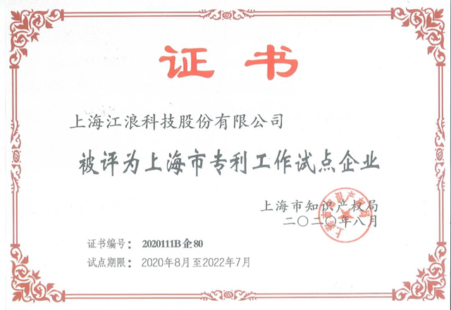 根據(jù)《上海市企事業(yè)專利工作試點示范單位認定和管理辦法》(滬知局﹝2017﹞62號)的要求,通過專家評審等程序,并經(jīng)市知識產(chǎn)權(quán)局黨組會審議,網(wǎng)上公示等一系列嚴格程序,江浪科技憑借在專利工作領(lǐng)域的優(yōu)異表現(xiàn),被評為上海市專利工作試點企業(yè)。