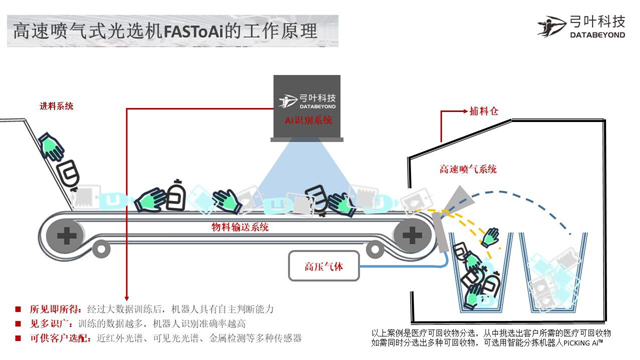 弓葉科技自主研發(fā)的智能垃圾分選裝備已實(shí)現(xiàn)落地應(yīng)用,目前參與了國內(nèi)多個(gè)垃圾處理項(xiàng)目,其中包含混合生活垃圾、可回收垃圾、廚余垃圾、餐廚垃圾、建筑垃圾等領(lǐng)域。同時(shí),弓葉科技還將其剛推出的高速噴氣式光選機(jī)FASToAI運(yùn)用到了醫(yī)療廢棄物處理領(lǐng)域中,幫助醫(yī)療機(jī)構(gòu)及醫(yī)廢處置單位降本增效,實(shí)現(xiàn)了對醫(yī)用級塑料垃圾的準(zhǔn)確分選,同時(shí)大大降低了醫(yī)療工作人員垃圾分類的工作量與時(shí)間成本。