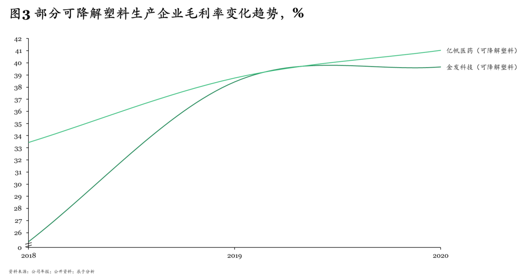 與此同時(shí),可降解塑料產(chǎn)品價(jià)格近一年來(lái)攀升,例如禁塑令前PLA價(jià)格為2萬(wàn)元/噸,現(xiàn)在一些地方的市場(chǎng)價(jià)已高達(dá)5萬(wàn)元/噸。這直接提升了行業(yè)整體盈利水平,例如金發(fā)科技、億帆醫(yī)藥等龍頭企業(yè)2019、2020年的毛利率均接近40%,相比2018年大幅提升(見(jiàn)圖3)。
