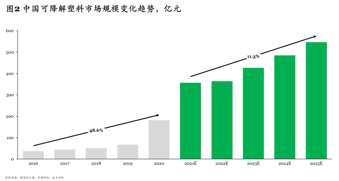 受此影響,作為傳統(tǒng)塑料替代產(chǎn)品的可降解塑料市場(chǎng)大幅度增長(zhǎng),訂單暴增,我們預(yù)計(jì)“十四五”期間,可降解塑料市場(chǎng)將以11.3%的年復(fù)合增速,到2025年實(shí)現(xiàn)500億元以上的收入規(guī)模(見(jiàn)圖2)。
