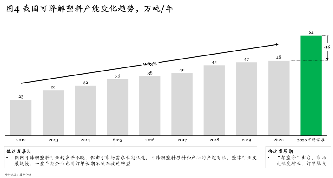 由于早前市場(chǎng)長(zhǎng)期低迷,國(guó)內(nèi)可降解塑料的產(chǎn)能增速一直較慢,據(jù)統(tǒng)計(jì), 2012~2020年間,這一數(shù)字的年復(fù)合增長(zhǎng)率為9.63%,到2020年達(dá)到48萬(wàn)噸/年,同年的市場(chǎng)需求則為64萬(wàn)噸/年,產(chǎn)能缺口較大(見(jiàn)圖4)。