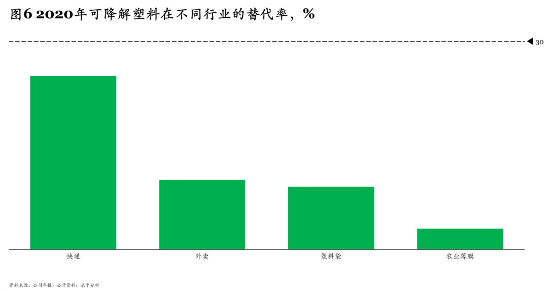 根據(jù)2020年“禁塑令”,主要限制使用的塑料制品有四類(lèi):塑料購(gòu)物袋、一次性塑料餐具、賓館酒店一次性塑料用品和快遞塑料包裝,超薄塑料袋和超薄農(nóng)膜的生產(chǎn)和銷(xiāo)售也受到限制。目前可降解塑料在這些行業(yè)中的替代率均較低,最高為快遞行業(yè)的25%,最低為農(nóng)膜行業(yè)的3%,均低于美國(guó)、荷蘭等國(guó)家30%的平均替代率(見(jiàn)圖6)。