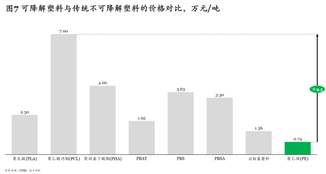 不可降解塑料如PP、PET、 PE等價(jià)格較低,可降解塑料價(jià)格明顯高于它們,目前主流可降解塑料如PLA、PHA、 PBAT的價(jià)格分別在1.6-3萬(wàn)元/噸、4萬(wàn)元/噸、1.4-2.5萬(wàn)元/噸左右,是PE價(jià)格的2~5倍, 而PCL 的價(jià)格甚至高達(dá)7萬(wàn)元/噸,是PE價(jià)格的9.5倍(見(jiàn)圖7)。