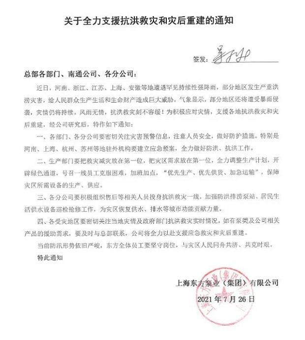 上海東方泵業(yè)(集團(tuán))有限公司河南分公司安陽(yáng)辦事處主任張國(guó)亮要求東方員工深入一線積極參與救援,以最快速度恢復(fù)城市運(yùn)行秩序、供水、排水等城市功能運(yùn)轉(zhuǎn)和群眾正常生活秩序。