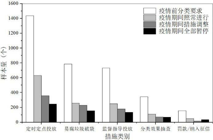 疫情期間生活垃圾分類體系的響應(yīng)主要表現(xiàn)在調(diào)停分類措施與新增防疫措施兩方面。55.3%已開(kāi)展分類社區(qū)做出分類調(diào)停改變,其中16.6%暫停了全部垃圾分類工作,措施調(diào)整則以暫停易腐垃圾破袋(59.8%)、撤除督導(dǎo)人員(56%)等人工依賴性高措施為主。85.5%社區(qū)新增防疫相關(guān)分類措施,新增措施以增設(shè)口罩專用收集桶(54.0%)、收集箱集中定點(diǎn)消殺(34.2%)為主,社區(qū)調(diào)整與新增措施比例及程度隨疫情風(fēng)險(xiǎn)增高而加大。疫情驗(yàn)證了定時(shí)定點(diǎn)模式推廣可行性,凸顯智能化分類模式在無(wú)人監(jiān)管、無(wú)接觸條件下維持分類監(jiān)管力度、保障分類質(zhì)量的巨大優(yōu)勢(shì),應(yīng)進(jìn)一步挖掘智能化分類模式應(yīng)用潛能。