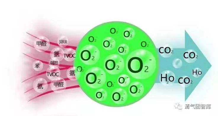 負離子與氣體分子(原子)發(fā)生非彈性碰撞,發(fā)生激發(fā)、離解、電離等一系列反應,使氣體處于活化狀態(tài)而產(chǎn)生的活性自由基以活化污染物分子,分子發(fā)生斷裂而被分解,最終可將惡臭氣體轉化為 CO2,H2O 等空氣中常態(tài)分子。