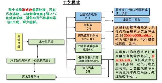 以自有研發(fā)的垃圾水分類技術(shù)為核心和前提,結(jié)合并優(yōu)化現(xiàn)有垃圾分類方法、資源再生技術(shù)的垃圾處理方法,整個(gè)系統(tǒng)滲濾液前置處理,沒有污水排放,無機(jī)物和金屬不進(jìn)入氣化焚燒系統(tǒng),避免有害氣體和有毒飛灰生成,減少能耗。以其恩施項(xiàng)目為典型案例,對(duì)其具有自主專利的垃圾水分類技術(shù)進(jìn)行了全面的介紹,具有綜合利用率80%以上,無二次污染,清洗水全部經(jīng)處理回用,氣化燃?xì)夂蜔煔馀欧胚_(dá)標(biāo)無隱患等技術(shù)特點(diǎn)。