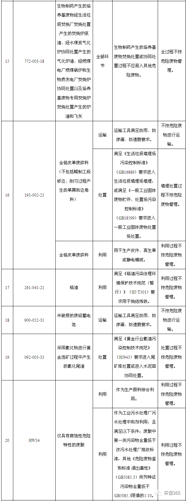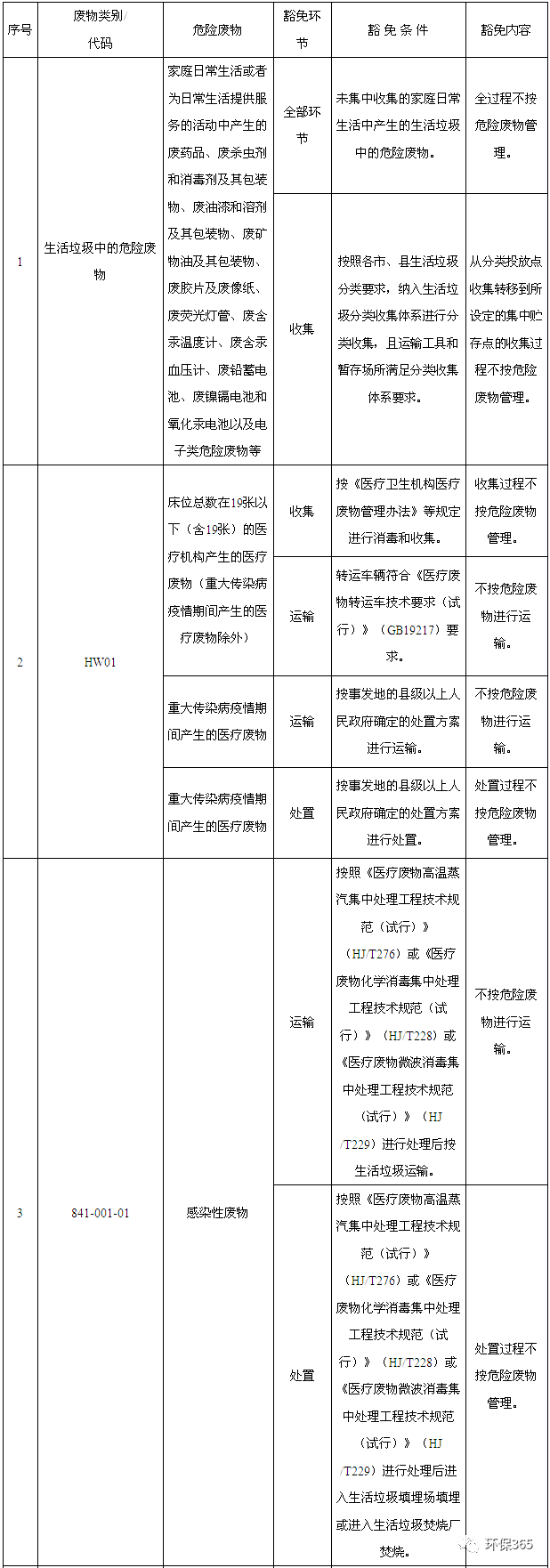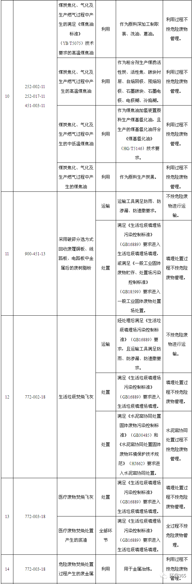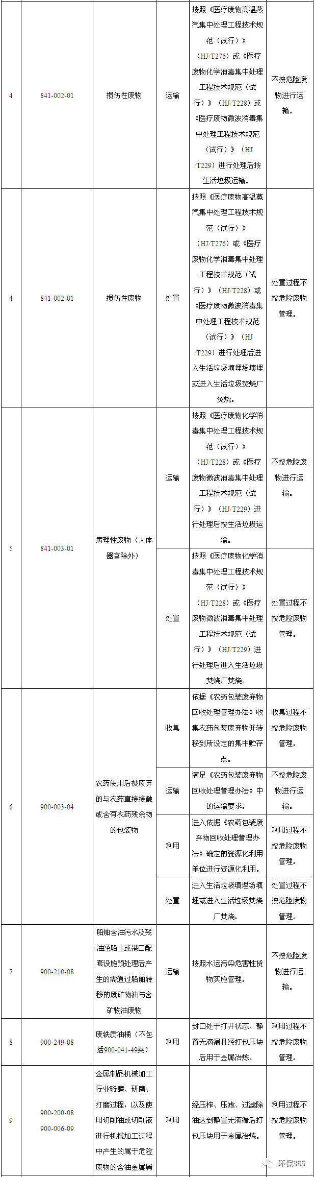 (1)家庭日常生活或者為日常生活提供服務的活動中產(chǎn)生的廢藥品、廢殺蟲劑和消毒劑及其包裝物、廢油漆和溶劑及其包裝物、廢礦物油及其包裝物、廢膠片及廢像紙、廢熒光燈管、廢含汞溫度計、廢含汞血壓計、廢鉛蓄電池、廢鎳鎘電池和氧化汞電池以及電子類危險廢物等未經(jīng)過集中收集的全部環(huán)節(jié)不按危險廢物管理;按照各市、縣生活垃圾分類要求,納入生活垃圾分類收集體系進行分類收集,且運輸工具和暫存場所滿足分類收集體系要求的,從分類投放點收集轉移到所設定的集中貯存點的收集過程不按危險廢物管理。(2)床位總數(shù)在19張以下(含19張)的醫(yī)療機構產(chǎn)生的醫(yī)療廢物(重大傳染病疫情期間產(chǎn)生的醫(yī)療廢物除外)按《醫(yī)療衛(wèi)生機構醫(yī)療廢物管理辦法》等規(guī)定進行消毒和收集的,收集過程不按危險廢物管理;轉運車輛符合《醫(yī)療廢物轉運車技術要求(試行)》(GB19217)要求的,不按危險廢物進行運輸;重大傳染病疫情期間產(chǎn)生的醫(yī)療廢物,按事發(fā)地的縣級以上人民政府確定的處置方案進行運輸?shù)?,不按危險廢物進行運輸;按事發(fā)地的縣級以上人民政府確定的處置方案進行處置的,處置過程不按危險廢物管理。(3)感染性廢物按照《醫(yī)療廢物高溫蒸汽集中處理工程技術規(guī)范(試行)》(HJ/T276)或《醫(yī)療廢物化學消毒集中處理工程技術規(guī)范(試行)》(HJ/T228)或《醫(yī)療廢物微波消毒集中處理工程技術規(guī)范(試行)》(HJ/T229)進行處理后按生活垃圾運輸?shù)?,不按危險廢物進行運輸;按照《醫(yī)療廢物高溫蒸汽集中處理工程技術規(guī)范(試行)》(HJ/T276)或《醫(yī)療廢物化學消毒集中處理工程技術規(guī)范(試行)》(HJ/T228)或《醫(yī)療廢物微波消毒集中處理工程技術規(guī)范(試行)》(HJ/T229)進行處理后進入生活垃圾填埋場填埋或進入生活垃圾焚燒廠焚燒的,處置過程不按危險廢物管理。(4)損傷性廢物按照《醫(yī)療廢物高溫蒸汽集中處理工程技術規(guī)范(試行)》(HJ/T276)或《醫(yī)療廢物化學消毒集中處理工程技術規(guī)范(試行)》(HJ/T228)或《醫(yī)療廢物微波消毒集中處理工程技術規(guī)范(試行)》(HJ/T229)進行處理后按生活垃圾運輸?shù)模话次kU廢物進行運輸;按照《醫(yī)療廢物高溫蒸汽集中處理工程技術規(guī)范(試行)》(HJ/T276)或《醫(yī)療廢物化學消毒集中處理工程技術規(guī)范(試行)》(HJ/T228)或《醫(yī)療廢物微波消毒集中處理工程技術規(guī)范(試行)》(HJ/T229)進行處理后進入生活垃圾填埋場填埋或進入生活垃圾焚燒廠焚燒的,處置過程不按危險廢物管理。(5)病理性廢物(人體器官除外)按照《醫(yī)療廢物化學消毒集中處理工程技術規(guī)范(試行)》(HJ/T228)或《醫(yī)療廢物微波消毒集中處理工程技術規(guī)范(試行)》(HJ/T229)進行處理后按生活垃圾運輸?shù)?,不按危險廢物進行運輸;按照《醫(yī)療廢物化學消毒集中處理工程技術規(guī)范(試行)》(HJ/T228)或《醫(yī)療廢物微波消毒集中處理工程技術規(guī)范(試行)》(HJ/T229)進行處理后進入生活垃圾焚燒廠焚燒的,處置過程不按危險廢物管理。(6)農藥使用后被廢棄的與農藥直接接觸或含有農藥殘余物的包裝物依據(jù)《農藥包裝廢棄物回收處理管理辦法》收集并轉移到所設定的集中貯存點的,收集過程不按危險廢物管理;滿足《農藥包裝廢棄物回收處理管理辦法》中的運輸要求的,不按危險廢物進行運輸;進入依據(jù)《農藥包裝廢棄物回收處理管理辦法》確定的資源化利用單位進行資源化利用的,利用過程不按危險廢物管理;進入生活垃圾填埋場填埋或進入生活垃圾焚燒廠焚燒的,處置過程不按危險廢物管理。(7)船舶含油污水及殘油經(jīng)船上或港口配套設施預處理后產(chǎn)生的需通過船舶轉移的廢礦物油與含礦物油廢物按照水運污染危害性貨物實施管理的,不按危險廢物進行運輸。(8)廢鐵質油桶(不包括900-041-49類)封口處于打開狀態(tài)、靜置無滴漏且經(jīng)打包壓塊后用于金屬冶煉的,利用過程不按危險廢物管理。(9)金屬制品機械加工行業(yè)珩磨、研磨、打磨過程,以及使用切削油或切削液進行機械加工過程中產(chǎn)生的屬于危險廢物的含油金屬屑經(jīng)壓榨、壓濾、過濾除油達到靜置無滴漏后打包壓塊用于金屬冶煉的,利用過程不按危險廢物管理。(10)煤炭焦化、氣化及生產(chǎn)燃氣過程中產(chǎn)生的滿足《煤焦油標準》(YB/T5075)技術要求的高溫煤焦油作為原料深加工制取萘、洗油、蒽油的,利用過程不按危險廢物管理。煤炭焦化、氣化及生產(chǎn)燃氣過程中產(chǎn)生的高溫煤焦油作為粘合劑生產(chǎn)煤質活性炭、活性焦、碳塊襯層、自焙陰極、預焙陽極、石墨碳塊、石墨電極、電極糊、冷搗糊的,利用過程不按危險廢物管理。煤炭焦化、氣化及生產(chǎn)燃氣過程中產(chǎn)生的中低溫煤焦油作為煤焦油加氫裝置原料生產(chǎn)煤基氫化油,且生產(chǎn)的煤基氫化油符合《煤基氫化油》(HG/T5146)技術要求的,利用過程不按危險廢物管理。煤炭焦化、氣化及生產(chǎn)燃氣過程中產(chǎn)生的煤焦油作為原料生產(chǎn)炭黑的,利用過程不按危險廢物管理。(11)采用破碎分選方式回收廢覆銅板、線路板、電路板中金屬后的廢樹脂粉運輸工具滿足防雨、防滲漏、防遺撒要求的,不按