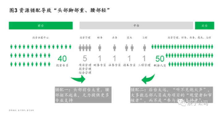 不難發(fā)現(xiàn),近年來(lái)一些企業(yè)開(kāi)始“招兵買(mǎi)馬”,大量招聘投資拓展人員,這對(duì)于企業(yè)提高投資拓展能力自然是好事。不過(guò)我們也注意到,一些企業(yè)在投資相關(guān)的人員配置上卻不盡合理:他們通常把大量投資拓展人員“撒在前線(xiàn)”,同時(shí)建立“大后臺(tái)”,與投資相關(guān)的投管、財(cái)務(wù)、法務(wù),甚至技術(shù)、工程、運(yùn)營(yíng)等人員主要負(fù)責(zé)項(xiàng)目質(zhì)量把關(guān)和風(fēng)險(xiǎn)管控,只有少量人員在中臺(tái)為前臺(tái)提供“彈藥”和支持(見(jiàn)圖3)。這種“頭重腳重”帶來(lái)兩個(gè)“錯(cuò)配”,一是頭部前臺(tái)太重,腰部挺不起來(lái),無(wú)力提供更多專(zhuān)業(yè)支持;二是腳部后臺(tái)太遠(yuǎn),“聽(tīng)不見(jiàn)炮火聲”,大多數(shù)人成為項(xiàng)目的“觀望者和審核者”,而不是“參與者和支持者”。