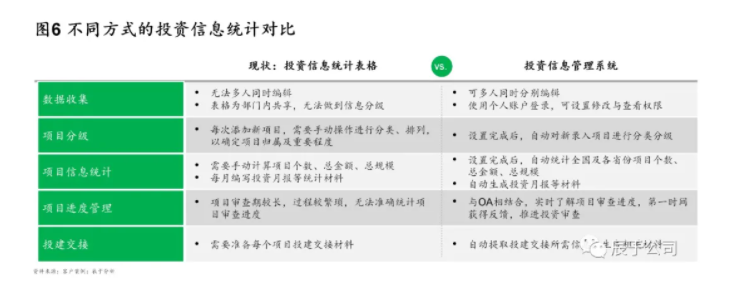 此外,我國(guó)生態(tài)環(huán)保產(chǎn)業(yè)數(shù)字化滲透率尚處于較低水平,即使是頭部企業(yè),也僅是在財(cái)務(wù)、行政、人力資源、工程等條線(xiàn)進(jìn)行了IT系統(tǒng)建設(shè),投資管理的IT系統(tǒng)建設(shè)很少,更別提利用大數(shù)據(jù)、機(jī)器學(xué)習(xí)、人工智能等先進(jìn)技術(shù)為投資決策提供支持了,不管是數(shù)據(jù)收集、還是項(xiàng)目分級(jí)、信息統(tǒng)計(jì)、進(jìn)度管理、投建交接等工作,基本依靠手動(dòng)操作,效率低下且容易出錯(cuò)(見(jiàn)圖6)。
