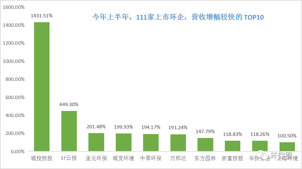 營收變動幅度方面,數(shù)據(jù)同樣喜人。111家上市環(huán)企,除了那些穩(wěn)步連續(xù)增長“卓越者”,每年總有一些讓人意想不到的“黑馬”企業(yè)率先突圍出來,少則百分之幾百增長,多則百分之上千增長,成為上半年?duì)I收增速最快的10家先鋒企業(yè)。在半年度營收增速TOP10中,既有坐落于上海的房產(chǎn)/水務(wù)/固廢“三劍齊發(fā)”的城投控股以及旗下的上海環(huán)境,也有因納入電價(jià)補(bǔ)貼、部分焚燒項(xiàng)目轉(zhuǎn)運(yùn)營推動業(yè)績大增的城發(fā)環(huán)境和圣元環(huán)保,亦有去年業(yè)績還萎靡不振的萬邦達(dá)和東方園林(如圖六所示)。圖六:半年度營收增速較快的TOP10榜單▼