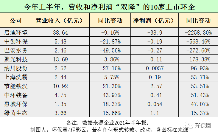 也就是說,今年上半年,111家上市環(huán)企中,無論是營業(yè)收入,還是歸母凈利潤方面,大家都表現(xiàn)得不錯,一掃2020年的悲觀情緒,70%以上的環(huán)保企業(yè)都向股東和市場交付了一張靚麗的答卷,實(shí)現(xiàn)了“后疫情時(shí)代”的強(qiáng)勢反彈。具體到個(gè)股,絕大多數(shù)企業(yè)也都在今年上半年開了個(gè)好頭,經(jīng)營業(yè)績打了個(gè)漂亮“翻身仗”。有的一改往日業(yè)績頹勢,歸母凈利潤實(shí)現(xiàn)百分之幾千增長,如雪浪環(huán)境,城發(fā)環(huán)境、雪迪龍;也有的逐步擺脫虧損帽子,歸母凈利潤實(shí)現(xiàn)百分之幾百的大增,如中金環(huán)境、嶺南股份、蒙草生態(tài)、津膜科技、菲達(dá)環(huán)保等;還有的細(xì)分領(lǐng)域龍頭,如上文提到格林美、碧水源、清新環(huán)境,也從去年疫情和產(chǎn)業(yè)寒冬的陣痛中慢慢地企穩(wěn)、好轉(zhuǎn),重現(xiàn)往日輝煌。歷經(jīng)了金融領(lǐng)域去杠桿、PPP政策強(qiáng)監(jiān)管、新冠肺炎疫情沖擊以及民企易主“混改潮”后,這些上市環(huán)企雖然有過迷茫,有過失敗,有過反思,但最終還是重拾信心,不屈不撓,終于迎來了業(yè)績復(fù)蘇。不過,今年上半年,在業(yè)績普遍好轉(zhuǎn)的背景下,依然還是有個(gè)別環(huán)保企業(yè)“不爭氣”,表現(xiàn)差強(qiáng)人意,比如啟迪環(huán)境、巴安水務(wù)、節(jié)能國禎、聚光科技、中環(huán)裝備等10家企業(yè)(如圖三所示),營收和凈利潤雙雙下滑,甚至有的企業(yè)較上年同期,虧損幅度擴(kuò)大化,前景堪憂。圖三:今年上半年,營收和凈利潤“雙降”的10家上市環(huán)企▼