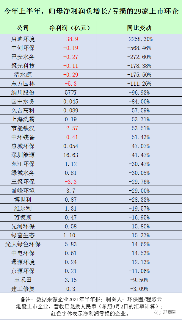 看完上半年?duì)I收增長情況,我們重點(diǎn)分析一下凈利潤。先說結(jié)論,今年上半年,111家環(huán)保上市企業(yè)中,歸屬于上市公司股東的凈利潤好于預(yù)期,遠(yuǎn)高于去年中報(bào)和年報(bào)。具體來看,111家上市環(huán)企,歸母凈利潤實(shí)現(xiàn)增長有83家,約占75%。也就是說,今年上半年度,只有25%企業(yè),約29家企業(yè)表現(xiàn)“不盡如意”,歸母凈利潤出現(xiàn)下滑/虧損情況,較去年中報(bào)的“近半數(shù)下滑”,減少了約25%。也有人說,今年中報(bào)不能與去年相比,是因?yàn)槿ツ晔艿揭咔橛绊?,特殊時(shí)期不作數(shù)。不過,今年中報(bào)的數(shù)據(jù),與去年年報(bào)的40%下滑率相比,同樣也減少了15%,再次說明了后疫情時(shí)代,除了個(gè)別企業(yè)環(huán)保股因?yàn)閭€(gè)別原因未能重振往日雄風(fēng)(如圖八所示),絕大多數(shù)企業(yè)則已經(jīng)通過出售股權(quán)、賣項(xiàng)目、傍身央企和國資,實(shí)現(xiàn)了逆風(fēng)翻盤。圖八:今年上半年,歸母凈利潤實(shí)現(xiàn)負(fù)增長/虧損的29家上市環(huán)企▼