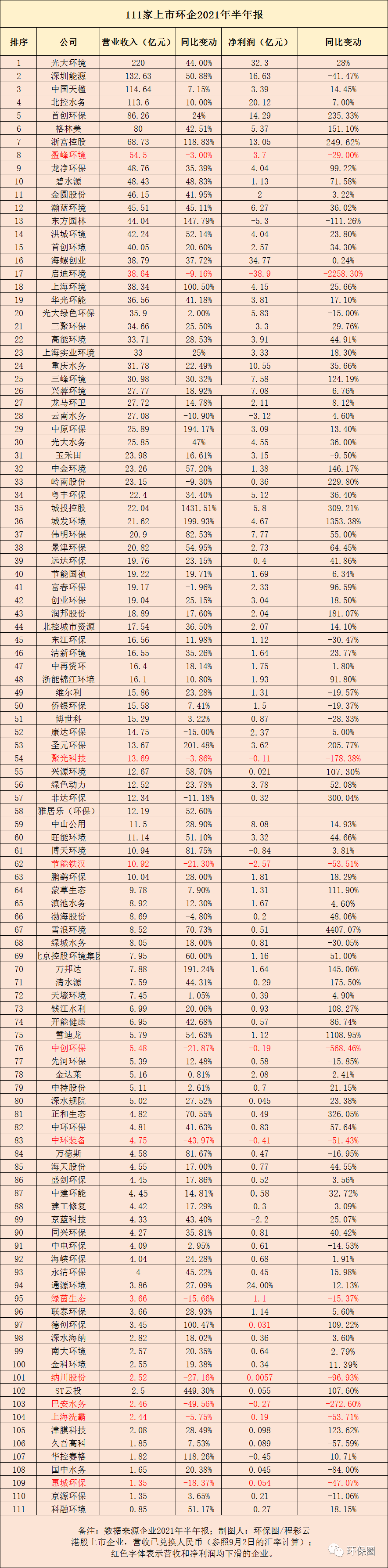 如往常一樣,每年筆者都會花費(fèi)2周左右時(shí)間統(tǒng)計(jì)制圖,通過營收、營收增幅、凈利潤、凈利潤增幅等幾方面的數(shù)據(jù)維度,為讀者展現(xiàn)每家上市環(huán)企的業(yè)績增長情況,以及頭部企業(yè)的變化,從中窺探整體產(chǎn)業(yè)的發(fā)展?fàn)顩r。還記得去年,在統(tǒng)計(jì)百余家上市環(huán)企2020年業(yè)績時(shí),曾經(jīng)反復(fù)提到到一句話——“疫情影響疊加產(chǎn)業(yè)寒冬余溫,大家普遍過得都不如從前了,別說10%、20%、30%增長,能活下來都不錯了?!?/strong>這種“王小二過年,一年不如一年”的形勢,曾經(jīng)導(dǎo)致百余家上市環(huán)企近半數(shù)表現(xiàn)不理想,要么營業(yè)收入負(fù)增長,要么歸母凈利潤下滑或虧損,其中不乏有排名非常靠前的細(xì)分領(lǐng)域龍頭,如北控水務(wù)、格林美、碧水源、啟迪環(huán)境、東江環(huán)保等,好的不好,差的更差。那么今年上半年呢?環(huán)保企業(yè)是繼續(xù)一蹶不振,業(yè)績持續(xù)低迷?還是東山再起,打了漂亮翻身仗?總體來看,今年上半年,111家上市環(huán)保企業(yè)中,營收同比增長的高達(dá)97家,占比87%;歸母凈利潤同比增加則有83家,約占75%;營收和歸母凈利潤“雙增”有75家,約占總數(shù)67%(如圖一圖二所示)。圖一:111家上市環(huán)保企業(yè)2021中報(bào)總體情況▼
