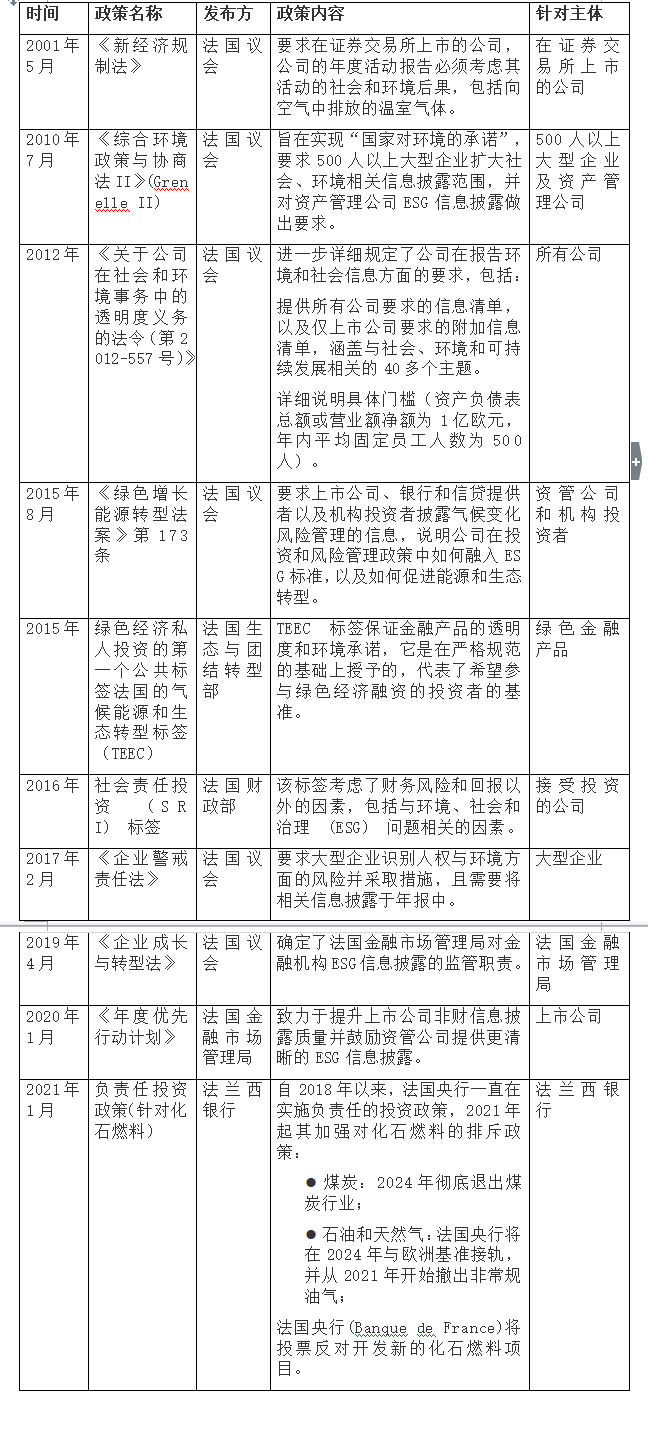 法國(guó)是全世界第一個(gè)將綠色金融納入法律范疇的國(guó)家。早在2001年,法國(guó)政府頒布新經(jīng)濟(jì)規(guī)制法案(NRE法案),啟動(dòng)強(qiáng)制性財(cái)務(wù)外報(bào)告,要求上市公司披露其活動(dòng)對(duì)環(huán)境和社會(huì)的影響。2010年的“Grenelle II 法案”第225條包含強(qiáng)制企業(yè)社會(huì)責(zé)任(CSR)信息披露的內(nèi)容,要求公司在年報(bào)中披露其環(huán)境及社會(huì)業(yè)績(jī)方面的信息。2012年,法國(guó)通過(guò)了關(guān)于公司在社會(huì)和環(huán)境事務(wù)中的透明度義務(wù)的法令(第2012-557號(hào)),進(jìn)一步詳細(xì)規(guī)定了公司在報(bào)告環(huán)境和社會(huì)信息方面的要求。對(duì)于法國(guó)金融界來(lái)說(shuō),《綠色增長(zhǎng)能源轉(zhuǎn)型法案》173條是最具影響力的法案,明確要求上市公司、銀行和信貸提供者以及機(jī)構(gòu)投資者(資產(chǎn)所有者和投資經(jīng)理)提高氣候變化相關(guān)風(fēng)險(xiǎn)的披露與透明度,該法案還包括與氣候相關(guān)金融信息披露工作組(TCFD)密切相關(guān)的措施,并要求法國(guó)當(dāng)局評(píng)估銀行業(yè)與氣候相關(guān)的風(fēng)險(xiǎn),法國(guó)成為世界上第一個(gè)對(duì)金融機(jī)構(gòu)提出ESG信息披露要求的主要經(jīng)濟(jì)體。2015年,法國(guó)生態(tài)與團(tuán)結(jié)轉(zhuǎn)型部發(fā)布了綠色經(jīng)濟(jì)私人投資的第一個(gè)公共標(biāo)簽——法國(guó)的氣候能源和生態(tài)轉(zhuǎn)型標(biāo)簽(TEEC),TEEC標(biāo)簽確保了金融產(chǎn)品的透明性和環(huán)保性,它授予條件嚴(yán)格,代表了參與綠色經(jīng)濟(jì)融資的投資者的要求。2016年,法國(guó)財(cái)政部提出了社會(huì)責(zé)任投資(SRI)標(biāo)簽,該標(biāo)簽考慮了財(cái)務(wù)風(fēng)險(xiǎn)和回報(bào)以外的因素,包括與環(huán)境、社會(huì)和治理(ESG)問題相關(guān)的因素。2021年1月,法蘭西銀行針對(duì)自身投資發(fā)布了一項(xiàng)新的負(fù)責(zé)任投資政策,以加強(qiáng)其對(duì)化石燃料的排斥政策。據(jù)此,法蘭西銀行表示到2024年底,完全排除所有從事煤炭相關(guān)活動(dòng)的公司,無(wú)論規(guī)模如何;2024年與歐洲基準(zhǔn)保持一致,2021年開始退出開始撤出非常規(guī)油氣;投票反對(duì)開發(fā)新的化石燃料項(xiàng)目。2021年3月,法蘭西銀行成立了氣候變化中心,以監(jiān)測(cè)其與氣候變化相關(guān)的所有舉措并確保其協(xié)調(diào)。