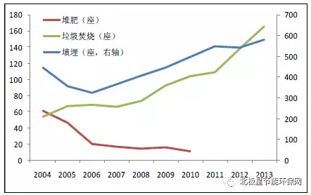 我國(guó)三種方式垃圾處理廠增長(zhǎng)情況(座)