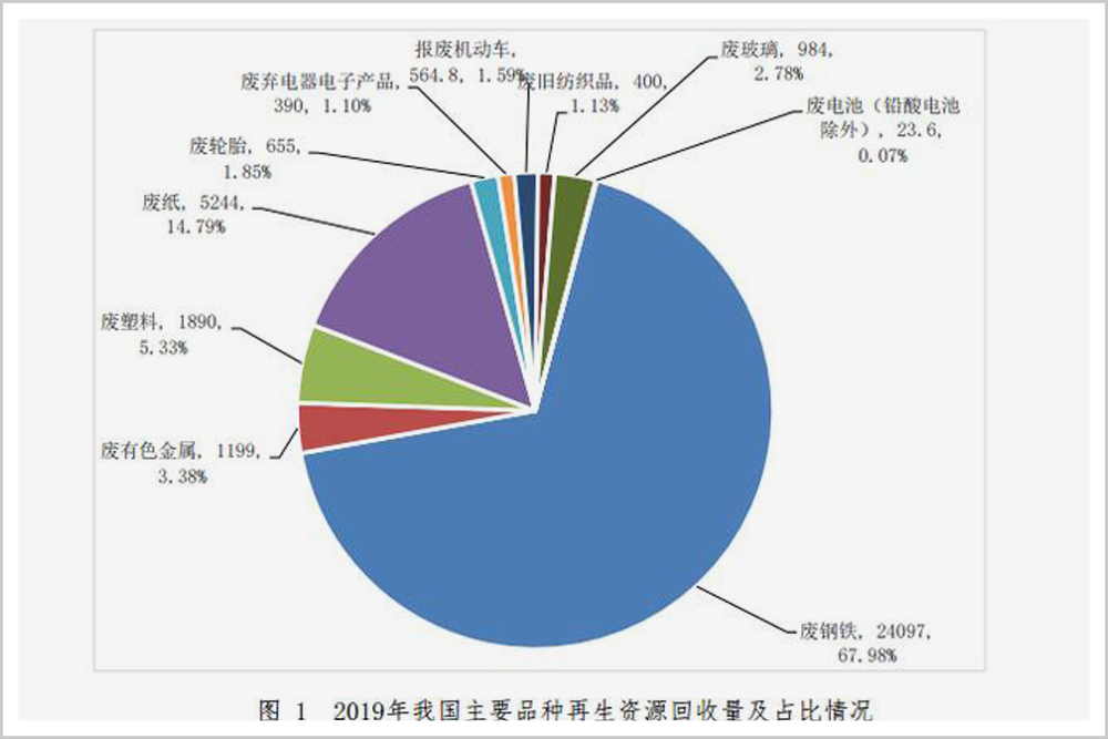 據(jù)商務(wù)部《中國再生資源回收行業(yè)發(fā)展報(bào)告(2020)》,我國可再生資源回收主要集中在廢鋼鐵、廢有色金屬、廢塑料、廢輪胎、廢紙、廢棄電器電子產(chǎn)品、報(bào)廢機(jī)動車、廢舊紡織品、廢玻璃、廢電池等領(lǐng)域,2019年底,它們的回收總量超過3.5億噸。