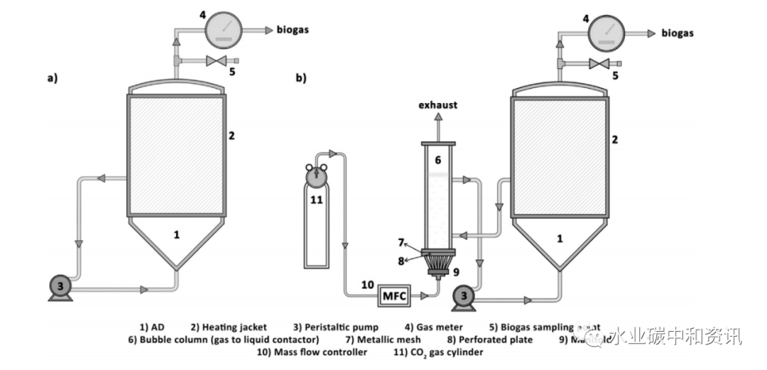 如上所述,剩余污泥與外源固體/液體有機物共消化是實現碳中和的一種潛在途徑。而在厭氧消化中投加CO2也能刺激甲烷產生。一項小試研究證明,向厭氧消化池中投加濃縮有機廢物,適當地提高有機負荷及縮短的停留時間,可以提高甲烷產量。因此,市政污水處理廠中可有效應用熱電聯產,以大大節(jié)省成本(Tandukar and Pavlostathis)。選擇口香糖制造廠和脫水脂肪油脂液產生的工業(yè)廢液作為外部有機物,與剩余污泥(初級﹕二級=40﹕60TS質量比)共消化。結果顯示,沼氣產量明顯增加,剩余污泥額外降解1.1~30.7%。沼氣和甲烷產量都非常接近能夠彌補能量赤字之目標水平。此外,共消化出水水質與只投加剩余污泥控制組相近,說明共消化沒有負面影響。其它有機物與剩余污泥共消化機制相同。一項小試究以牛糞(MN)與外部有機廢物(食品廢物—FW、堿性水解液—AH和粗制甘油—GY)共消化與牛糞單獨消化對比(Usack and Angenent; Regueiro et al.);運行900 d后,4組中溫平行共消化反應器顯示出比甲烷產量(SMY)信息,與GY共消化最適宜總有機負荷率(OLR)為3.2 gVS/L·d(MN : GY = 62:38),最佳SMY為549±25 ml CH4/gVS;FW與AH共消化SMY數值相近(約300 ml CH4/gVS,對應OLD =3.9 gVS/L·d,MN:FW = 51:49及OLD = 2.7 gVS/L·d,MN:AH=75:25)。眾所周知,CO2是在消化過程中伴隨著甲烷產生的產物。而另一方面,利用厭氧消化進行CO2捕集固定是一種潛力十足的碳減排策略。兩個處理食品垃圾的厭氧消化試驗進行了225 d監(jiān)測,實驗組定期使用氣泡柱充入CO2(Fernandez et al.)。實驗組測試CH4產率為0.56±0.13 m3 CH4/kgVS·d(對照組為0.45±0.05 )沼氣中CH4濃度為68%,額外攝取了外源CO2 0.55 kg,H2濃度增加了2.5 倍,這歸因于CO2溶解以及酸化與產氫途徑改變。