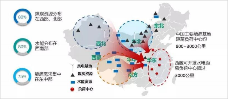 我國能源稟賦與用電負荷在地理上存在較大的不平衡性,全國80%的煤炭資源分布在西北,80%的水能分布在西南,但能源需求的75%集中在中東部,能源富集地區(qū)距離東中部電力需求中心1000到4000公里左右。